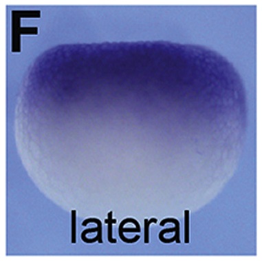 bcar3 (breast cancer anti-estrogen resistance 3) gene expression in Xenopus laevis embryo, assayed via in situ hybridization, NF stage 9, lateral view, animal up. |