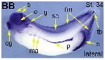bcar1 (breast cancer anti-estrogen resistance 1) gene expression in Xenopus laevis embryo, assayed via in situ hybridization, NF stage 34, lateral view, anterior left, dorsal up. |