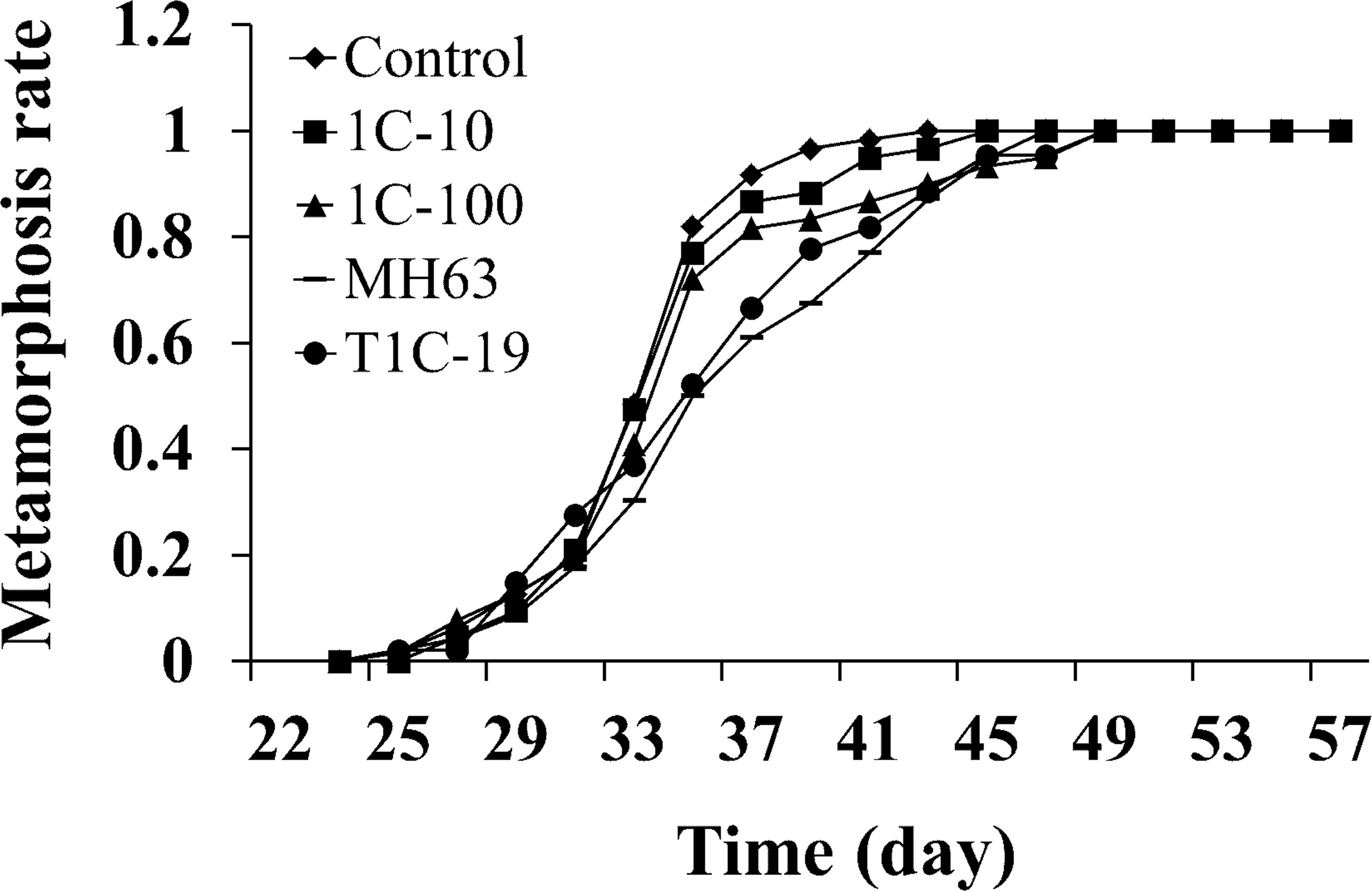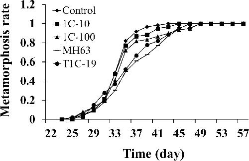 Fig 1. The time to completed metamorphosis (TCM) curves of Xenopus laevis tadpoles exposed to purified Cry1Ca and transgenic cry1Ca rice (T1C-19) straw.