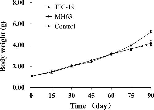 Fig 2. The growth curves of Xenopus laevis froglets (body weight) when fed diets containing transgenic cry1Ca rice (T1C-19) or non-transformed rice isoline (MH63) grains, or a blank control diet for 90 days (n = 4).