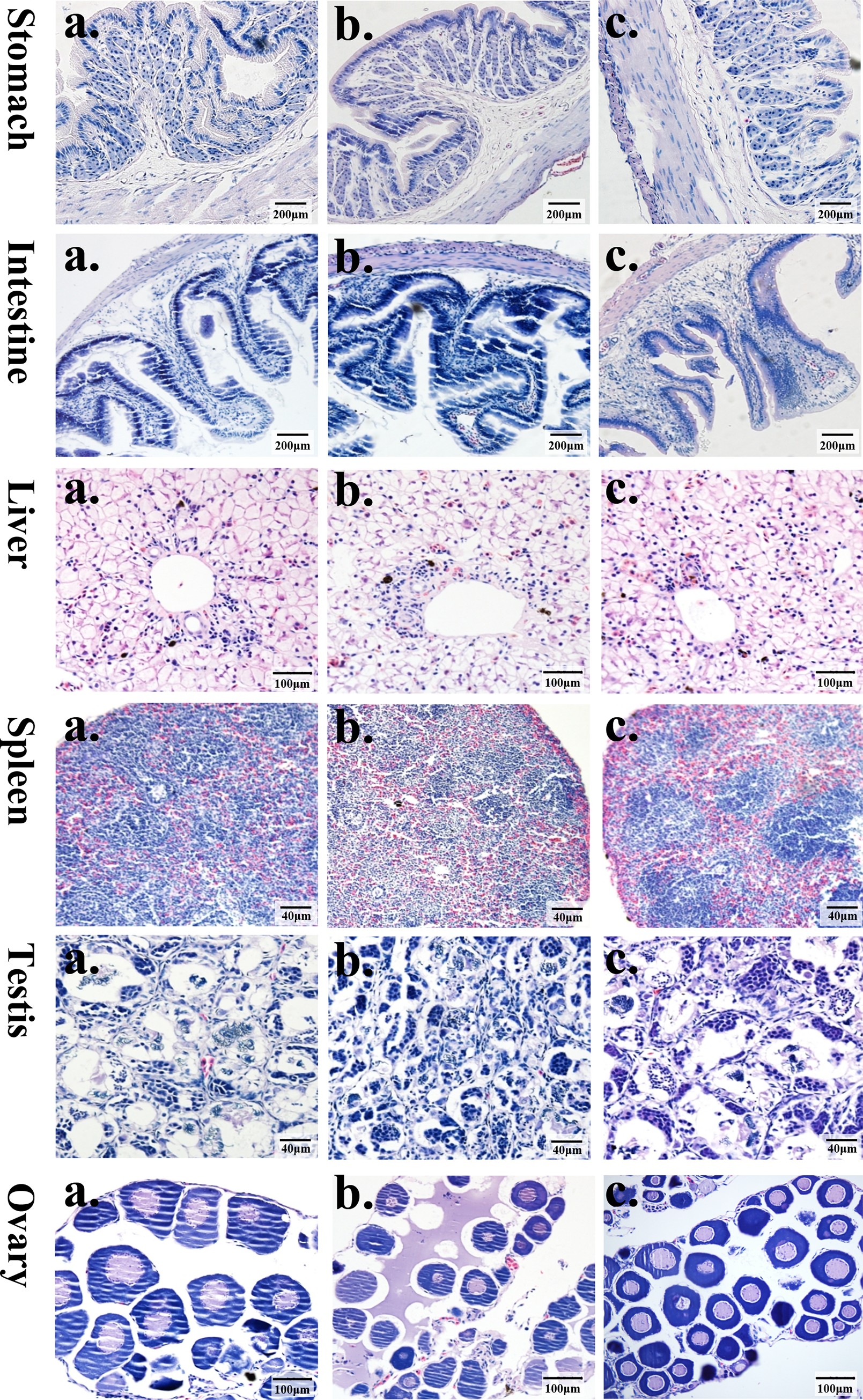 Fig 3. Histopathological staining of tissues from Xenopus laevis froglets after consuming the transgenic cry1Ca rice (T1C-19) test diet (a), the non-transformed isoline (MH63) test diet (b), or the blank control diet (c) for 90 days.