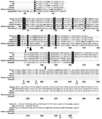 Supplementary Figure 3. Homology of TPOsfrom various vertebrate species. Amino acid sequence homology of mature TPOs from human, rat, mouse, chicken, X. laevis, and zebrafish. Numbers represent positions from the N-terminal end of mature xlTPO. The predicted signal peptide is shown at the top and indicated in lowercase letters. Identical amino acid residues are shaded black. Cysteine residues that form possible disulfide bridges in xlTPO are boxed. Positions of potentialN-linked carbohydrate on xlTPO and hTPOare indicated by solid and open arrowheads, respectively. Potential sites for N-glycosylation are conserved in human, rat, and murine TPOs, whereas zebrafish, chicken, and X. laevisTPOs lack a C-terminal domain. The thrombin cleavage site in hTPOis indicated by an arrow. The tertiary structure of human TPO has been solved as an antiparallel four-helix bundle fold. TPO sequences were obtained from GenBank(accession numbers: human, AAI30323; rat, BAA06906; mouse, AAA40436; chicken, AAT45554; zebrafish, NP_001137225). |