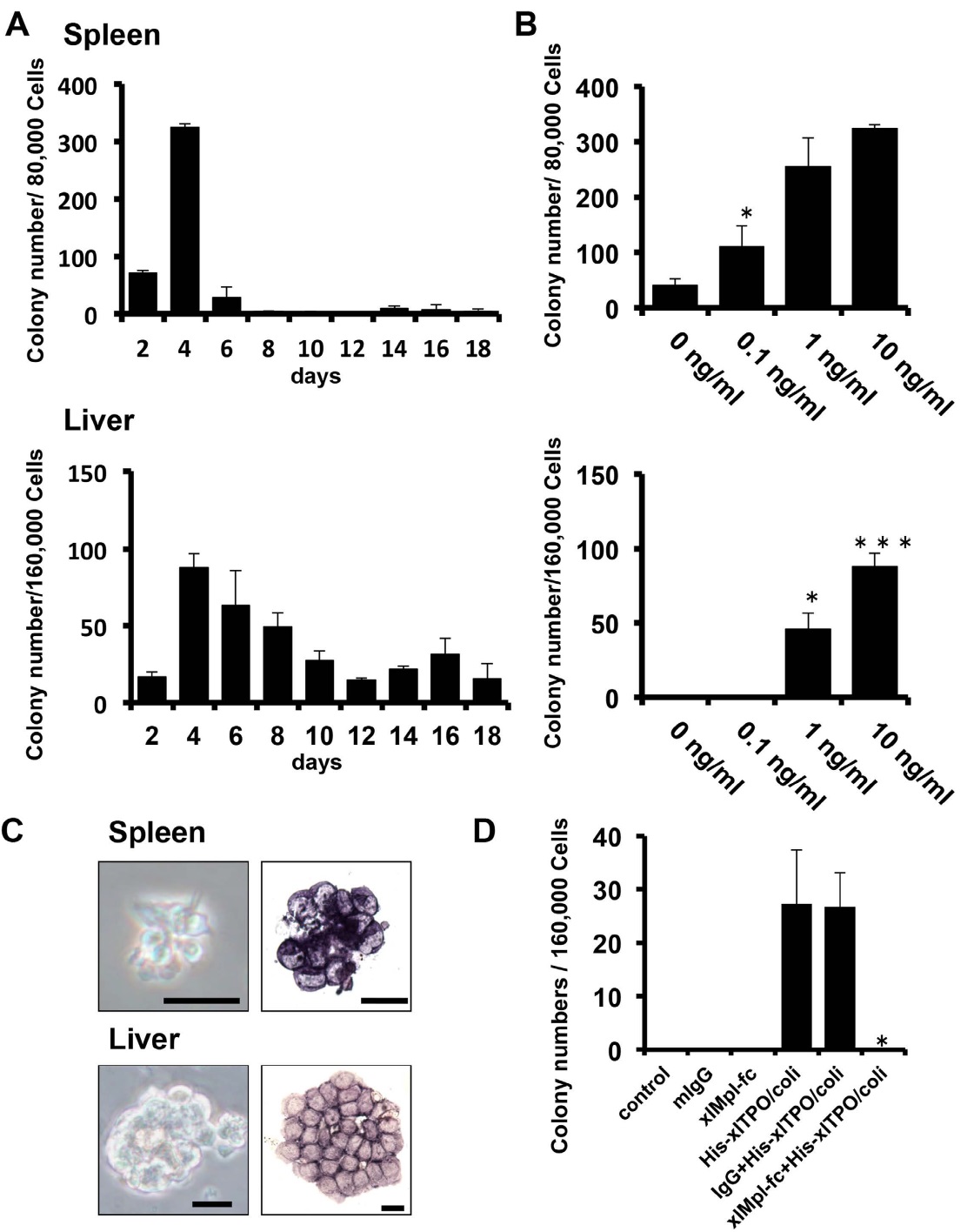Figure 2. Biological activity of recombinant X. laevis TPO. (A) Colony-formation of spleen and liver cells in response to xlTPO. Upper panel shows the time course of colony formation by spleen cells; lower panel represents liver cells. (B) Dose-response effect of recombinant xlTPO on blast colony formation by splenic and hepatic cells. The upper panel shows spleen cell colony formation; the lower panel represents liver cells. Graphs represent means + SD, n = 3. *P < 0.05 vs. 0 ng/mL; **P < 0.05 vs. 0.1 ng/mL; ***P < 0.05 vs. 1.0 ng/mL. (C) Colony morphology. Left panels show colonies derived from X. laevis spleen and liver cells after 4 days culture in semisolid medium in the presence of xlTPO. Scale bars represent 20 μ m. Right panels show the morphology of T12-stained colonies. (D) Hepatic cells were incubated with xlMpl-Fc fusion protein or normal mouse IgG2a as a control in the presence of xlTPO, and cultured in semi-solid media. After 4 days, xlMpl-Fc fusion protein inhibited colony formation; colonies formed in the presence of xlTPO alone or both xlTPO and IgG2a. Graphs represent means + SD, n = 3. *P < 0.05 vs. xlTPO or IgG2a + xlTPO stimulation. |