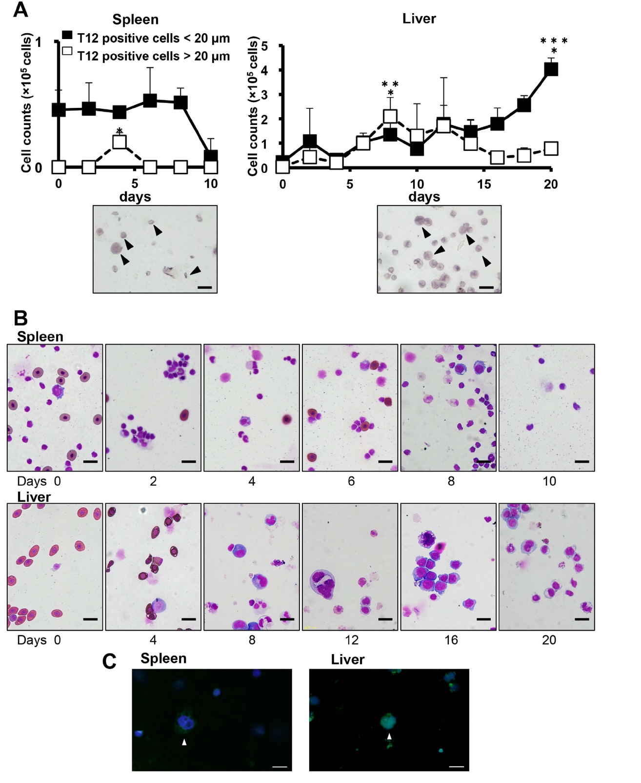 Figure 3. Proliferation and differentiation of hepatic and splenic thrombocytic cells. (A) Thrombocytic cell counts during liquid culture of spleen (Left) and liver (Right) cells in the presence of xlTPO. Cultured hepatic cells were cytocentrifuged onto slides, immunostained for T12, and counted. Open squares show T12-positive cells > 20 μ m; black squares indicate cells < 20 μ m. *P < 0.05 vs. day 0; **P < 0.05 vs. day 0; ***P < 0.05 vs. day 20 in T12-positive large cells. The lower panel shows large and small T12-positive cells derived from splenic and hepatic cells after 4 and 8 days of culture in medium containing xlTPO. Scale bars represent 20 μ m. Graphs represent means + SD, n = 5. (B) After 2 to 20 days culture in the presence of xlTPO, hepatic or splenic cells were cytocentrifuged onto glass slides and stained with May-Grunwald-Giemsa (MGG). Scale bar indicates 20 μ m. (C) The morphology of T12-positive splenic or hepatic cells after culture in the presence of xlTPO for 4 days. Immunostaining for T12 was performed. Biotinylated T12 was detected by streptavidin-conjugated Alexa Fluor 488 (green). Nuclei were counterstained with Hoechst 33342. Bars represent 20 μm. |