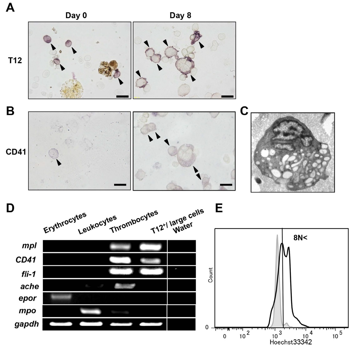 Figure 4. Characterization of large MKs. (A) The morphology of pre-culture hepatic cells as demonstrated with T12 immunostain. After eight days in the presence of xlTPO, the hepatic cells were again immunostained for T12. Arrowheads indicate T12+ cells. Bars represent 20 μ m. (B) The 8-day cultured cells were also immunostained with CD41 polyclonal antibody. Arrowheads indicate CD41+ cells. Bars represent 20 μ m. (C) Transmission electron micrographs of MK on day 8. (D) Expression profiles of X. laevis Mpl, CD41, Fli-1, AchE, EPOR, MPO, and GAPDH mRNA in peripheral blood cells and MK. Peripheral erythrocytes, leukocytes, and thrombocytes were collected and prepared as described in Materials and Methods. (E) Ploidy of MKs after xlTPO stimulation for eight days versus normal peripheral blood as a control. |