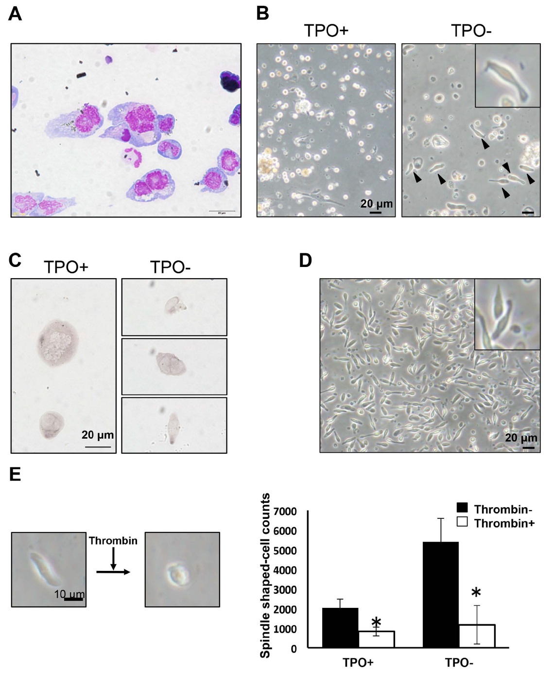 Figure 5. Maturation of thrombocyte-like cells from MKs. (A) MKs were enriched by density-gradient centrifugation. The 50% layer was collected and stained with MGG. (B) Enriched MKs were cultured in the presence or absence of xlTPO. After two days suspension culture in the absence of xlTPO, spindle-shaped thrombocyte-like cells were observed (solid arrowheads and inset). Bars represent 20 μ m. (C) The morphology of cultured hepatic cells. Enriched MKs were cultured for two days in the presence or absence of xlTPO; hepatic cells were cytocentrifuged onto slide glass and stained with T12. (D) The morphology of peripheral thrombocytes in suspension after two days (inset). (E) Whole cultured thrombocytes were incubated with or without thrombin, and the proportion of spindle-shaped thrombocytes was calculated. Left panels show the changing morphology of cultured thrombocyte-like cells. Graphs represent means + SD, n = 6. *P < 0.05 vs. thrombin-. |