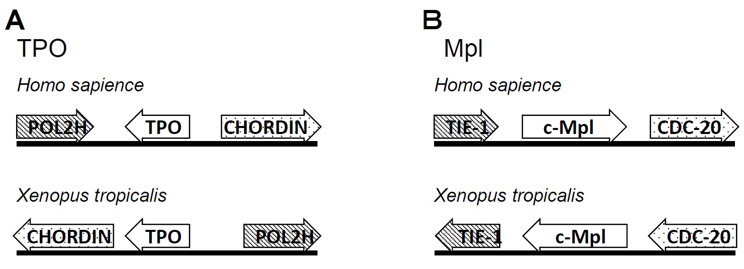 Supplementary Figure 2. Conserved syntenyand homology between the X. tropicalisand human TPO and Mplloci. (A) RNA polymerase II H (POL2H) and Chordin, mapped in the hTPOlocus, were identified by NCBI Homologeneor BLAST search in the X.tropicalisgenome database. The syntenyof POL2H, CHORDIN, and TPO at the human, mouse, chicken, and X. tropicalisTPO loci was conserved, although their order and direction of transcription has been shuffled (B) TIE-1 and CDC-20 in xlMplwere identified by NCBI Homologeneor BLAST in the X. tropicalisgenome database. The syntenyof TIE-1, CDC-20, and Mplat the human, mouse, chicken, and X. tropicalisMplloci was also conserved, although their order and direction of transcription has been shuffled. |