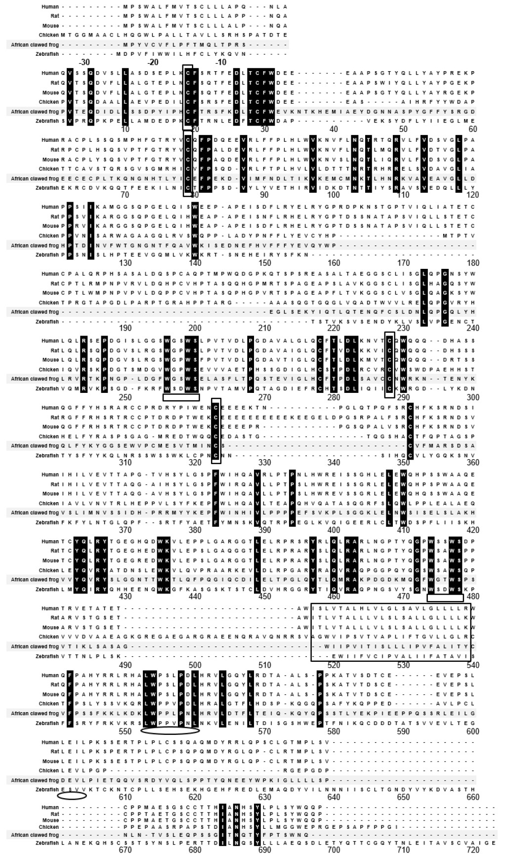 Supplementary Figure 4. Homology of Mplsfrom various vertebrate species. Amino acid sequence homology of mature Mplsfrom human, rat, mouse, chicken, zebrafish, and X. laevis. Numbers indicate positions from the N terminus of the mature xlTPO. The predicted signal peptide is shown at the top and indicated by lowercase letters. Identical amino acid residues are shaded black. Cysteine residues that form possible disulfide bridges in xlMplare boxed. Putative transmembrane domains are underlined. White boxes indicate tryptophan-serine-x-tryptophan-serine (WSXWS) motifs and the Box1 and Box2 regions, thought to be important for mitogenicsignaling. Mplsequences were obtained from GenBank(accession numbers: human, NP_005364; mouse, NP_001116421; chicken, NP_001001782; zebrafish, NP_001003858).The xlTPO and xlMplsequences have been submitted to DDBJ/EMBL/GenBankwith accession numbers AB256538 and AB272077. |