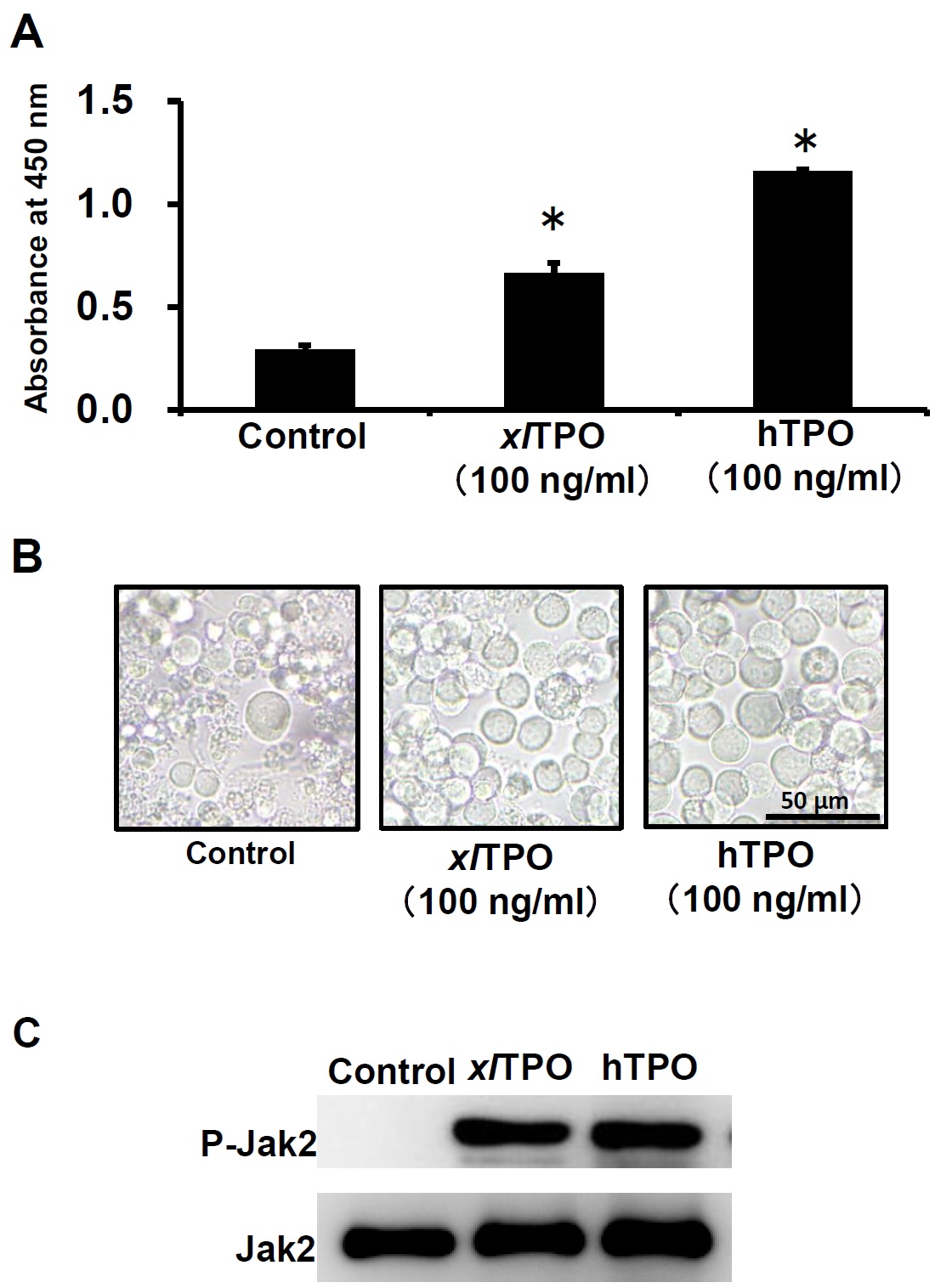 Supplementary Figure 5. Proliferation of UT-7/TPO cells after xlTPO stimulation. (A) MTS assay of UT-7/TPO cells. UT-7/TPO cells were stimulated with xlTPO or hTPOfor 72 h in 96-well plates and analyzed by MTS assay. Controls were the UT-7/TPO cells cultured in the absence of TPO for 72 h. *P < 0.05 vs. the control. (B) Cell morphology of UT-7/TPO cells. UT-7/TPO cells were stimulated with xlTPO or hTPOfor 72 h. (C) JAK2 phosphorylation. UT-7/TPO cells were cultured overnight in the absence of serum and growth factor in IMDM. Cells were stimulated with xlTPO or hTPOfor 5 min and phosphorylated JAK2 was measured by western blotting. |