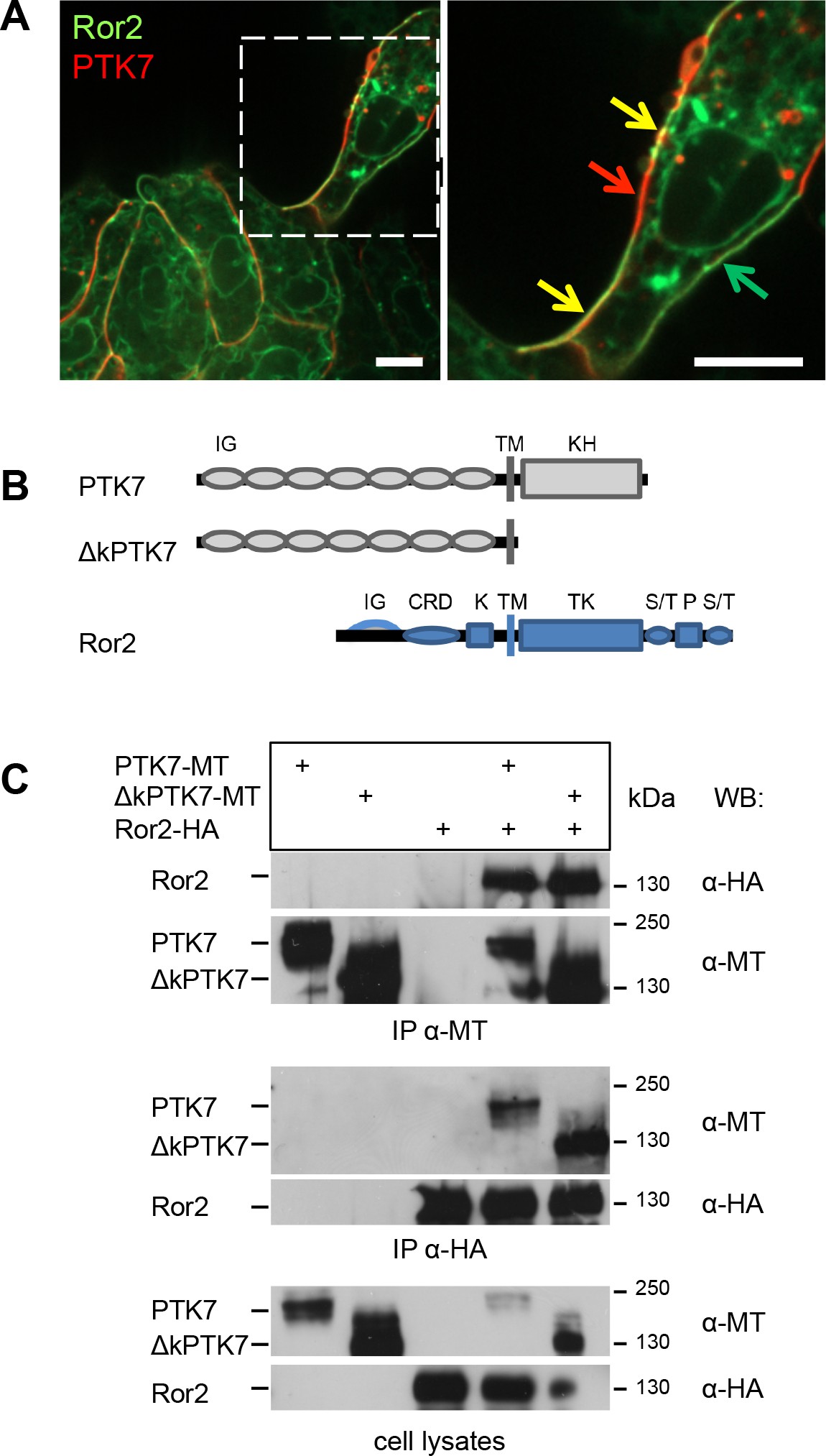 Fig 1. PTK7 and Ror2 co-localize in NC cells and co-precipitate independent of the kinase-homology domain of PTK7. A Co-localization of PTK7 and Ror2. NC cells co-expressing Ror2-EGFP and PTK7-RFP show distinct areas of co-localization (yellow) as well as membrane areas where only PTK7-RFP (red) or Ror2-EGFP (green) is localized. The right panel shows a higher magnification of the single cell in the left panel (indicated by a dashed square), scale bar = 10 μm. B,C Co-immunoprecipitation of PTK7 and Ror2. Full-length myc-tagged PTK7 (PTK7-MT) and a myc-tagged PTK7 deletion construct lacking the kinase homology domain (∆kPTK7-MT) as well as a full-length HA-tagged Ror2 construct were expressed in MCF7 cells. B Constructs and their protein domains are depicted in the top panel. Abbreviations are as follows: IG (immunoglobulin domain), CRD (cysteine-rich domain), K (kringle domain), TM (transmembrane domain), KH (kinase homology domain), TK (tyrosine kinase), S/T (serine/threonine-rich domain), P (proline-rich domain). C Immunoprecipitation experiment; the cell transfection scheme is indicated at the top. Co-immunoprecipitation was carried out using either anti-myc (IP α-MT, upper panel) or anti-HA antibodies (IP α-HA, middle panel). The respective cell lysates are shown in the bottom panel. Antibodies used for Western blotting and molecular weights are indicated at the right. doi:10.1371/journal.pone.0145169.g001 |