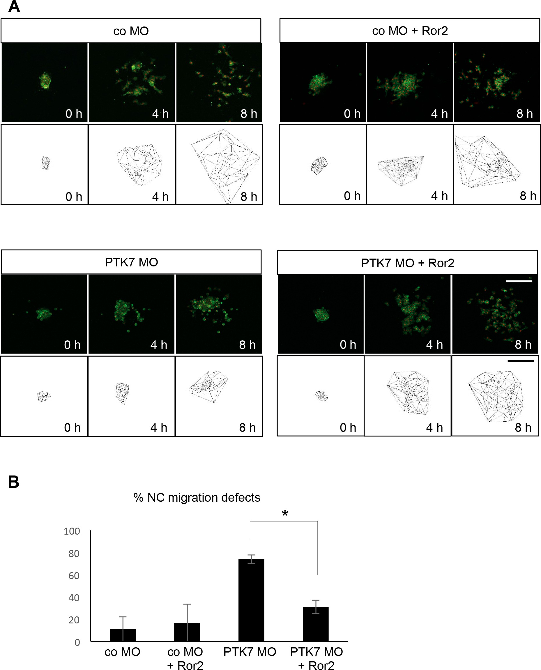 Fig 4. Ror2 rescues the PTK7 loss of function phenotype in explanted NC cells. A NC explants injected with 7.5 ng MO in combination with 50 pg mGFP RNA, 250 pg H2B-mcherry and 150 pg Ror2 RNA. Time-lapse images (upper panel) and Delaunay triangulations (lower panel) at the start of the experiment (0 h) and after 4 or 8 hours are shown for the different conditions. B Graph summarizing percentage of migration defects of 3 independent experiments (total of 39 explants). Standard error of the means are shown. Asterisks indicates a p-value in a Student’s t-test < 0.05. Scale bars = 200 μm. doi:10.1371/journal.pone.0145169.g004 |