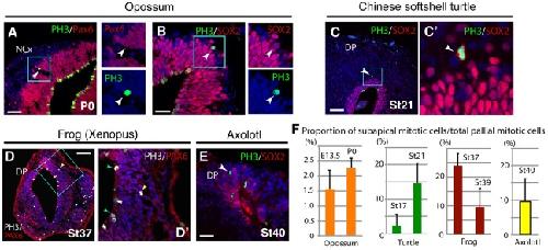 Fig. 4. Comparative analysis of basal mitotic cells in various tetrapod species. (A,B) Distribution of PH3+ cells in the developing opossum cortex (M. domestica, P1). PH3+ basal mitotic cells (arrowheads) expressed Pax6 (A) or Sox2 (B). (C,Câ²) A PH3+ basal mitotic cell (arrowhead) was Sox2+ in the developing turtle cortex. (D,E) Distribution of PH3+ cells in developing Xenopus (D,Dâ²) and axolotl (E). Arrowheads indicate in green (Dâ²) indicate PH3+ cells at the ventricular surface; arrowheads in yellow (D,Dâ²) and white (E) indicate PH3+ cells at the basal side of the ventricular zone. (F) The proportion of basal mitotic cells among all pallial mitotic cells in various tetrapods. Mean±range (opposum, turtle, axolotl) or mean±s.d. (Xenopus). Scale bars: 100â µm in A,C,D; 50â µm in B,E.