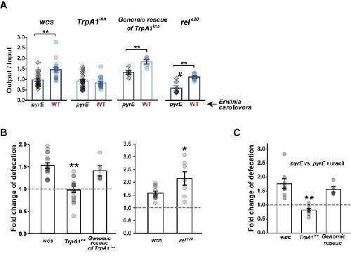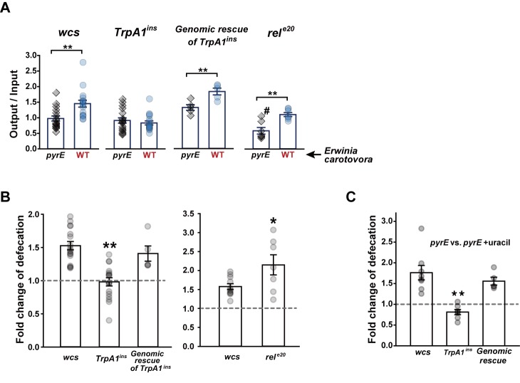 Fig 4. TrpA1-dependent defecation is required for bacteria expulsion from the gut.A Defecation of indicated Drosophila lines fed with either Ecc15 pyrE or Ecc15 wild-type (WT) was presented as output/input denoting the fecal spot number normalized by ingestion volume (n = 5–17). B Quantitative representation of (A) as defecation fold difference of indicated genotypes. Left, The wcs flies fed with ECC15 WT at OD600 of 10 defecate ~1.5 fold more than those fed with ECC15 pyrE, while TrpA1ins did not show higher defecation with ECC15 WT. Right, rele20 lacking the imd pathway show higher defecation frequency with ECC15 WT over pyrE. C Defecation comparison between pyrE ingestions with and without supplementation of 1 mM uracil (n = 5–8). Defecation of ECC15 pyrE-ingested flies is increased by supplementing uracil, and the increase requires TrpA1. #: p<0.05, Student’s t-test between wcs and rele20 fed with Ecc15 pyrE (A). *: p<0.05, **: p<0.01, Student’s t- or Tukey tests.