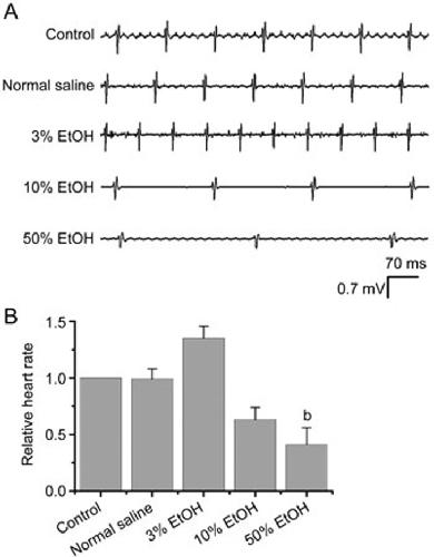 Figure 1. Electrocardiogram (ECG) changes in rats with acute ethanol treatments. (A) ECG recordings in adult male Wistar rats. Representative tracings of ECG recorded from individual rat before and after injection with 0.3 mL of normal saline or a solution containing 3%, 10% or 50% ethanol (v/v). Each solution was injected into the abdomen of a different rat fixed by two cortical electrodes. The proper position of ECG leads was monitored by the telemetry signal quality using the recording software, and all of the ECG traces were recorded until the quality of the ECG signal was considered acceptable, usually approximately 40 min after each treatment for an individual rat. The ∼1-s ECG recordings were mainly used for average heart rate measurements, albeit the voltage amplitude values being remarkably reduced, especially in the rats that were injected with high concentrations of ethanol (eg, 50%). (B) Comparison of heart rate responses to different treatments (n=3–6). Mean±SEM. bP<0.05 vs control. EtOH, ethanol.