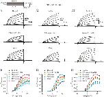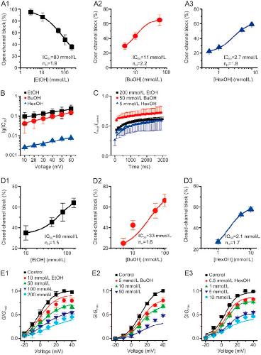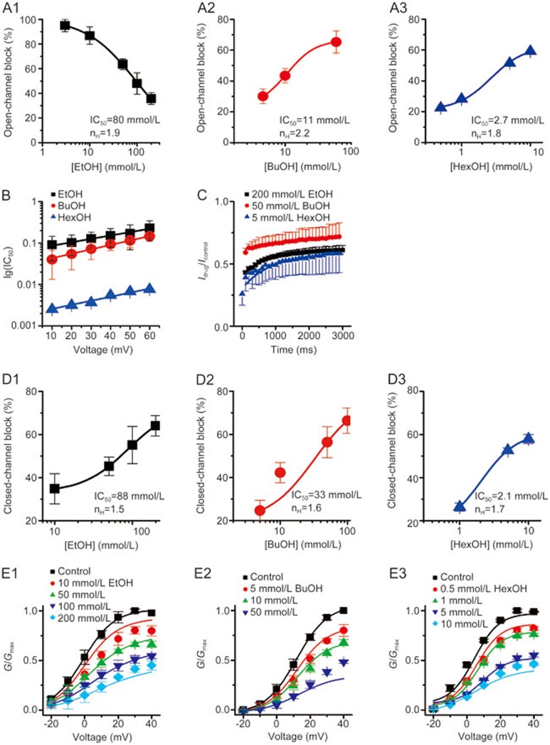 Figure 3. 1-Alkanols inhibit IKs currents in both the open and closed state of wild-type KCNQ1/KCNE1 channels. (A) Dose-response curves for the open-channel block were plotted for EtOH (A1; n=4), BuOH (A2; n=5) and HexOH (A3; n=5) at +20 mV and were fitted to the Hill equation. Both the IC50 values and the corresponding Hill coefficient nH are indicated on each panel. (B) Voltage-dependence of IC50 values for EtOH (n=4), BuOH (n=4) and HexOH (n=3). The solid lines are the lines of best fit of the function k(V)=k(0)×exp(−zFV/RT), where k(0) represents the IC50 for 1-alkanols at 0 mV, and z is the fitted value for fractional charges moved during block reaction. The variables of F, R and T have their standard definitions. For EtOH, k(0)=0.0718 with z=−0.4749; k(0)=0.0338 with z=−0.6200 for BuOH; and k(0)=0.0021 with z=−0.5688 for HexOH. (C) Time courses and fractional inhibitions of KCNQ1/KCNE1 currents evoked at +60 mV in the presence of 200 mmol/L EtOH (n=4), 50 mmol/L BuOH (n=4) and 5 mmol/L HexOH (n=5). (D) Dose-dependence of three 1-alkanols effects on the closed state KCNQ1 channels. The inhibition values or ratios by 1-alkanols at the closed state were derived from the values at the intersection of the prolonged line of Idrug/Icontrol and the zero time axis (t=0 s), as shown in Figure 3C. The solid line represents a Hill equation fit. (E) Normalized conductance-voltage relationship. The conductances that were obtained from steady state currents at the end of the pulse in the presence of various concentrations of EtOH (E1), BuOH (E2) and HexOH (E3) were simultaneously fit to a four-state block model (Model I) as described in the main text (solid lines). The optimal fit for the open and closed-channel block (OB-CB) yielded KOB=90±8.2 mmol/L, KCB=60.8±7.0 mmol/L for EtOH (E1), KOB=20±5.2 mmol/L, KCB=17.6±6.1 mmol/L for BuOH (E2) and KOB=5.0±2.1 mmol/L, KCB=1.6±1.5 mmol/L for HexOH (E3). The error bars represent the SEM. EtOH, ethanol; BuOH, 1-butanol; HexOH, 1-hexanol.