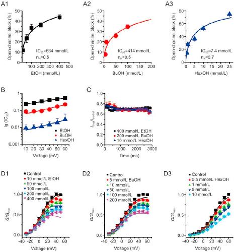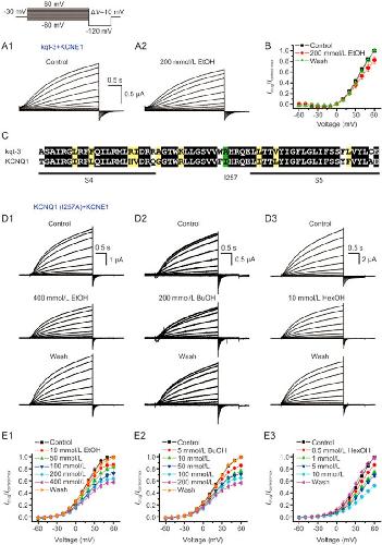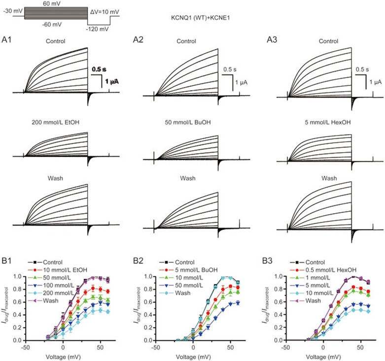 Figure 2. Extending the alkyl chain length augments the inhibition efficiency of 1-alkanols on IKs currents as recorded in oocytes. (A) Representative currents were recorded from oocytes expressing wild-type KCNQ1/KCNE1 under two-electrode voltage–clamp by voltage steps from −60 to +60 mV in 10-mV increments lasting for 3 s in the presence and absence of 200 mmol/L ethanol (termed as EtOH; A1), 50 mmol/L 1-butanol (BuOH; A2) and 5 mmol/L 1-hexanol (HexOH; A3) as indicated. Voltage protocols included above current traces. (B) Summary plots of I–V curves before and after exposure to different concentrations of EtOH (B1; n=4), BuOH (B2; n=5) and HexOH (B3; n=5) as indicated. All of the currents at each concentration were normalized to their respective control values.