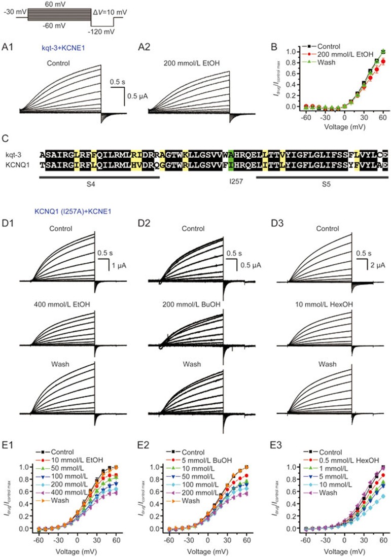 Figure 4. I257, the residue in the intracellular linker of transmembranes S4 and S5, is critical for the 1-alkanol inhibition of KCNQ1 channels. (A) Effects of ethanol on kqt-3 currents. Representative outward current in oocytes expressed with kqt-3 and KCNE1 were evoked by step depolarizations from −90 mV to +60 mV in 10-mV increments in the presence and absence of 200 mmol/L EtOH. The interpulse interval was 3 s. Voltage protocols are presented above current traces. (B) Summary plots of relative currents over voltage before and after exposure to different concentrations of EtOH (n=4), showing that ethanol (200 mmol/L) has a slight effect on kqt-3 currents. (C) An amino acid alignment of the linker of S4 and S5 between C elegans kqt-3 and human KCNQ1. (D) Representative current traces from oocytes that were injected with KCNQ1 (I257A) and KCNE1 in response to voltage steps from −60 to +60 mV in 10-mV increments for 3 s in the presence and absence of 400 mmol/L EtOH (D1), 200 mmol/L BuOH (D2) and 10 mmol/L HexOH (D3) as indicated. (E) Summary plots of relative current over voltage before and after exposure to different concentrations of EtOH (B1; n=4), BuOH (B2; n=5) and HexOH (B3; n=5) as indicated. All of the currents at each concentration were normalized to their respective control values. The error bars indicate the SEM. EtOH, ethanol; BuOH, 1-butanol; HexOH, 1-hexanol.
