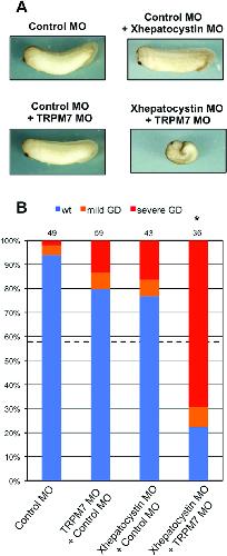 Figure 4. TRPM7 and hepatocystin functionally interact.(A,B) Co-injection of Xhepatocystin MO (15âng) and XTRPM7 MO (15âng) synergistically inhibit gastrulation, but have little or no effect when injected separately. (B) Phenotypes were scored according to the severity of the gastrulation defect (GD) at the tadpole stage. The dotted line in (B) indicates the amount of gastrulation defects that would be expected if the effects were additive (43%). The injections were repeated three times. Statistic analysis indicated that the number of embryos exhibiting gastrulation defects (77%) by co-injection of Xhepatocystin and XTRPM7 MOs was significantly different (P=0.05) from what would be expected if the effects were additive (43%). The collective total number of injected embryos from all three experiments is indicated above each bar.