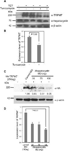 Figure 5. Hepatocystin and N-glycosylation affect the abundance of TRPM7.(A) Treatment of cells with tunicamycin (5 μg/ml) for 24 hours decreased tetracycline-induced TRPM7 protein expression in 293-TRPM7 cells. (B) Quantification of data from (A). (C) Co-injection of increasing dosages of the Xhepatocystin MO with 250 pg mRNA of HA-tagged mTRPM7 (HA-TRPM7) decreases TRPM7 expression in Xenopus embryos at stage 17. β-actin is shown as a loading control. (D) Quantification of data from (C). The experiments were repeated at least three times.