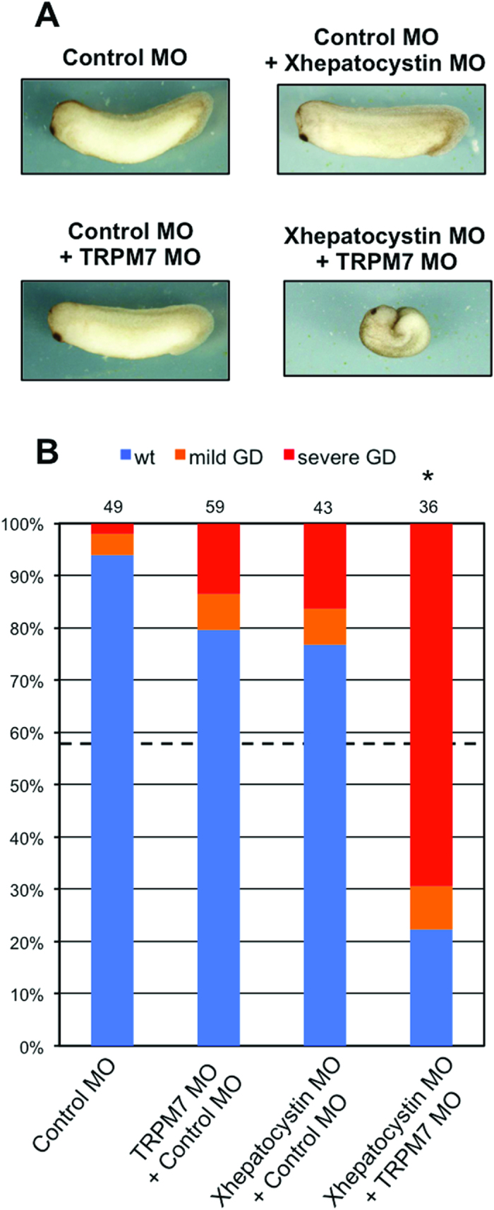 Figure 4: TRPM7 and hepatocystin functionally interact. (A,B) Co-injection of Xhepatocystin MO (15âng) and XTRPM7 MO (15âng) synergistically inhibit gastrulation, but have little or no effect when injected separately. (B) Phenotypes were scored according to the severity of the gastrulation defect (GD) at the tadpole stage. The dotted line in (B) indicates the amount of gastrulation defects that would be expected if the effects were additive (43%). The injections were repeated three times. Statistic analysis indicated that the number of embryos exhibiting gastrulation defects (77%) by co-injection of Xhepatocystin and XTRPM7 MOs was significantly different (P=0.05) from what would be expected if the effects were additive (43%). The collective total number of injected embryos from all three experiments is indicated above each bar.