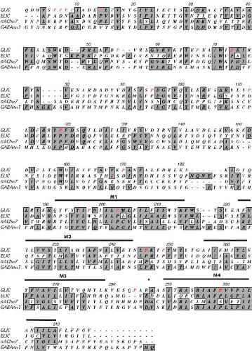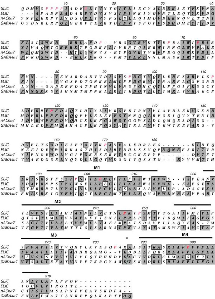 FIGURE 1. Sequence alignment of GLIC, ELIC, and two example eukaryotic pLGIC subunits: nAChR α7 and GABAA R α1. Prolines examined in this study are shown in red. Shaded residues are conserved or similar in side-chain character among sequences. The M3/M4 loop of the eukaryotic receptors has been removed at *.