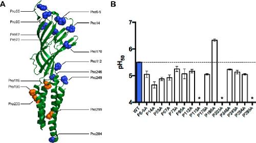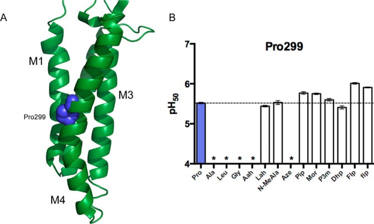 A, The GLIC TM domain, highlighting Pro-299 (PDB: 3EHZ). B, pH50 values for GLIC Pro-299 mutants. Data shown are mean ± S.E., with n = 7–20. Typical maximal currents from functional mutants generated by nonsense suppression were 0.5–5 μA. *, pH-induced responses comparable with uninjected cells.