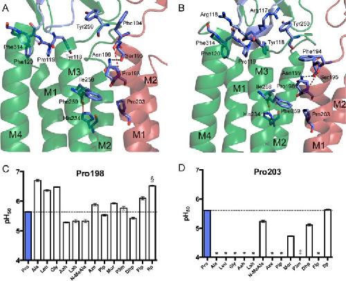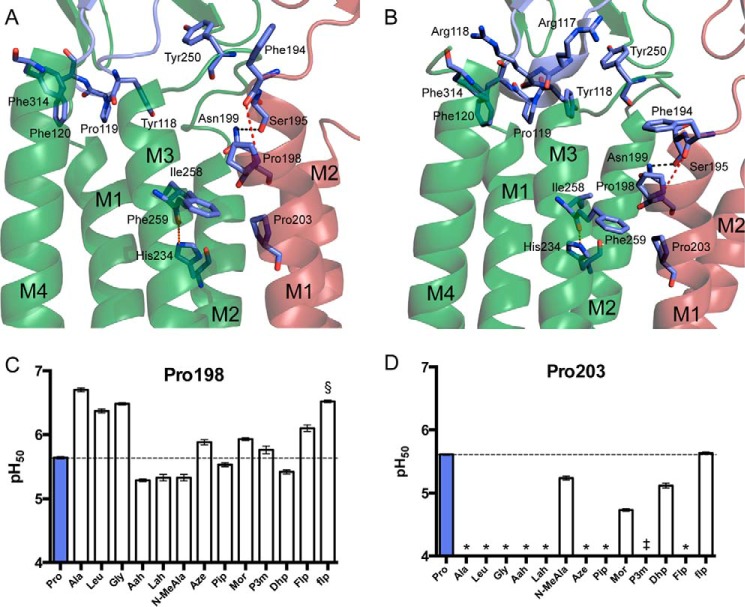 A and B, Pro-198 and Pro-203 in the top of the M1 helix at pH 7 (PDB: 4NPQ) (A) and pH 4 (PDB: 3EHZ) (B). Shown are a hydrogen bond between Asn-199 and the main-chain carbonyl of Ser-195 (black), the disrupted hydrogen bond hypothesized to be restored by conventional mutagenesis at Pro-198 (red), and the interhelix hydrogen bond between His-234 and the Ile-258 carbonyl (green). C and D, pH50 values for GLIC Pro-198 (C) and Pro-203 (D) mutants. Data shown are mean ± S.E., with n = 8–20. Conventional mutants at Pro-198 gave currents comparable with wild type GLIC. Typical maximal currents from functional mutants generated by nonsense suppression were 0.5–3 μA, with P198Lah giving responses as high as 20 μA. *, pH-induced responses comparable with uninjected cells; §, a biphasic curve was observed with a low-sensitivity component having pH50 < 4.5; ‡, currents were observed, but pH50 was too low to measure (< 4.5) due to nonspecific acid-induced currents.