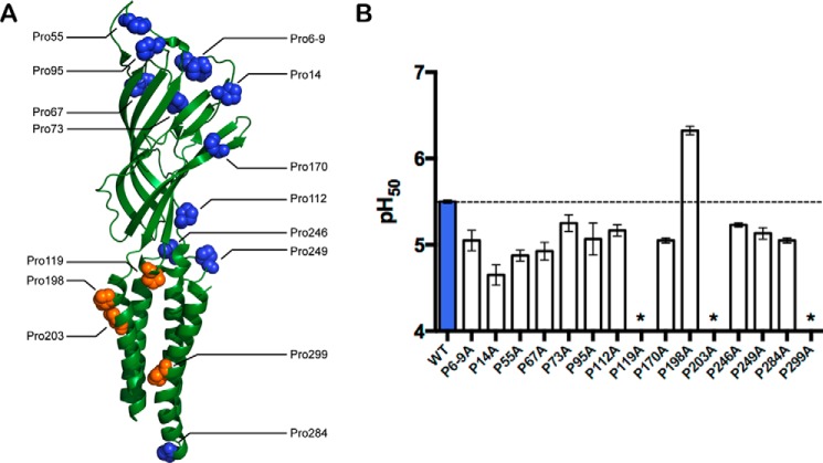 A, GLIC subunit structure, indicating proline residues (PDB: 3EHZ). B, conventional mutagenesis of GLIC Pro residues. Substitution with Ala mostly had little or no effect on pH50 values, although P119A and P203A were nonfunctional, and P198A had increased sensitivity. P6-9A indicates simultaneous substitution of prolines at sites 6, 7, 8, and 9 with Ala; individual Ala substitutions at these sites yielded similar pH50 values (not shown). Data shown are mean ± S.E., n = 3–4. *, pH-induced responses were comparable with uninjected cells. Typical maximal responses for WT and all Ala-containing mutants were 20–40 μA, except for P14A, where maximal responses were 2–5 μA.