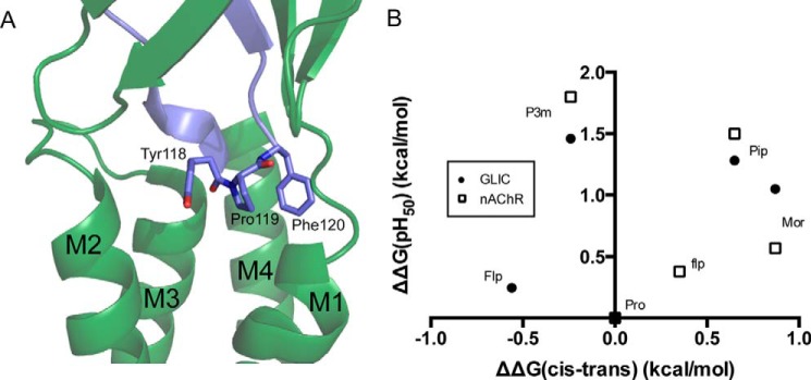 A, the ECD/TM interface in GLIC, highlighting the YPF motif in the cis conformation (PDB: 3EAM). B, relationship between mean pH50 values and cis-trans preferences for Pro analogs at Pro-119 in GLIC (filled circles), when compared with the analogous position (Pro-136) in the muscle-type nAChR (open squares) (17). Typical maximal currents for functional mutants generated by nonsense suppression were 0.5–2 μA, with P119Pip giving responses as high as 10 μA.