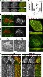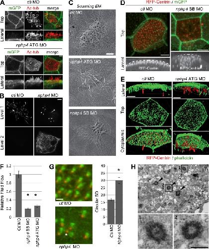Figure 2. Xenopus Nphp4 is essential for building functional cilia. (A and B) Confocal microscopy of multiciliated cells of Xenopus epidermal skin. Cilia and apical cell surface are labeled with antiâacetylated tubulin (Ac-tub; red in merge) and membrane-targeted GFP (mGFP; green in merge). (A) Maximum intensity projection (top), and 3D reconstruction projected in the x-z plane (lateral) for the confocal datasets are shown. The apical surface is indicated by a solid white line. Embryos injected with 20 ng control morpholino (ctl MO) showed normal ciliogenesis, whereas 20 ng nphp4 ATG MOâinjected embryos showed ciliogenesis defects. (B) Single optical sections comparing the signals for antiâacetylated tubulin at levels 1 and 2 in ctl MOâ and nphp4 ATG MOâtreated Xenopus embryos (see dashed white lines in the lateral views of A) revealed that ciliary microtubules are nucleated below the apical cell surface in nphp4-deficient, but not ctl MOâtreated, Xenopus embryos. (C) Scanning EM of the Xenopus epidermis confirmed the ciliogenesis defect in 16 ng nphp4 ATG MOâ and 8 ng nphp4 SB MOâinjected Xenopus embryos. (D) Labeling of basal bodies and the apical cell surface with RFP-Centrin and mGFP revealed that basal bodies are aligned along the apical cell surface and distributed uniformly across the cell surface in ctl MOâinjected Xenopus embryos. In contrast, basal bodies in nphp4 MOâinjected Xenopus embryos failed to migrate to the apical cell surface and remained within the cytoplasm. (Top) Maximum intensity projection of confocal datasets. (Bottom) Serial confocal images projected in the x-z plane with the apical cell surface indicated by a dashed white line. (E) The multiciliated cells of the Xenopus epidermis formed a dense actin cytoskeleton (phalloidin, green) at the apical cortex. Apically localized basal bodies (RFP-Centrin, red) were embedded in this actin web (left). In nphp4-deficient Xenopus embryos, basal bodies remained within the cytoplasm below the apical actin web, which is also thinner than in control cells (right). Confocal 3D datasets were processed with Imaris software, and the lateral (top), top (middle), and cytoplasmic (bottom) views are shown. (F) Depletion of nphp4 resulted in a decreased rate of cilia-driven fluid flow as revealed by the movement of polypropylene beads across the epidermis. Shown is a summary of four independent experiments (n ⥠25). Error bars, SEM; t test; *, P < 0.002. (G) nphp4-deficient Xenopus embryos showed a mild perturbation of basal body polarization, revealed by the relative position of the basal bodies (RFP-Centrin) and the ciliary rootlets (GFP-Clamp). A moderate dose of 6.8 ng nphp4 SB MO was injected to allow apical docking of basal bodies, a prerequisite for polarization. The right panels show the magnified images for the regions enclosed by white boxes. Only a small number of basal bodies were incorrectly polarized (asterisk) in nphp4-deficient cells. The polarization was quantified by angular measurements of Clamp/Centrin pairs. Depletion of nphp4 resulted in a moderate increase of circular standard deviation as compared with the control. Error bars, SEM. (H) Transmission electron microscopy detected occasional ciliary axonemes (white arrowhead, box 1), and a large number of basal bodies (black arrowheads, box 2) in the cytoplasm of nphp4-depleted Xenopus multiciliated cells. Bars: (AâE) 5 µm; (G) 1 µm; (H) 200 nm. |