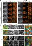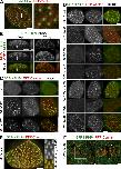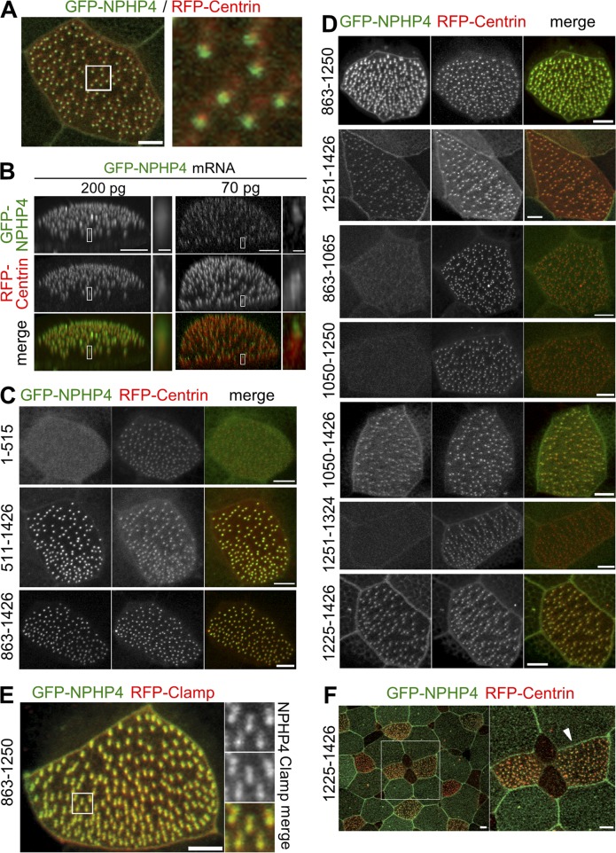 Figure 1. Localization of full-length and truncated NPHP4 in multiciliated cells of the Xenopus epidermis. At the four-cell stage, Xenopus embryos were injected with mRNA for GFP-NPHP4 (green in merge), together with mRNAs for RFP-Centrin or RFP-Clamp (red in merge) to label basal bodies and ciliary rootlets, respectively. At stage 32, confocal microscopy was performed to study the localization of full-length and truncated NPHP4 in the cells with multiple motile cilia of epidermal skin. Maximum intensity projection of obtained confocal datasets is shown, unless noted otherwise. (A) Colocalization of GFP-NPHP4 with RFP-Centrin. Area enclosed by the white box is magnified in the right panel (5.3× magnification; see Fig. S1 A for separate GFP and RFP channels). (B) 3D reconstruction of confocal datasets is shown. Injection of mRNA encoding for GFP-NPHP4 (200 pg) revealed the broad localization of GFP-NPHP4 extending from the basal body to the presumptive transition zone distal to the basal body, whereas lower-dose injection of mRNA (70 pg) revealed a more confined localization of GFP-NPHP4 to the presumptive transition zone. The insets are magnified on the right panels. (C–F) Localization of NPHP4 truncations is studied. Numbers on the left of the panels indicate the first and last amino acid of the NPHP4 truncations. Expression of all constructs was confirmed by Western blot. (C) The C-terminal half of NPHP4 (amino acids 863–1,426) is sufficient for localization to the basal body. (D–F) The C-terminal half of NPHP4 contains two distinct subdomains targeting NPHP4 to the basal bodies: amino acids 863–1,250 and amino acids 1,251–1,426. (E) The first subdomain (amino acids 863–1,250) showed additional localization to the ciliary rootlet, colocalizing with RFP-Clamp. The inset is magnified by 2.4× on the right panels. (F) The C-terminal fragment spanning amino acids 1,225–1,426 showed enhanced localization to the plasma membrane (arrowhead). Area enclosed by the white box is magnified in the right panel. Bars: (main) 5 µm; (B, magnified insets) 500 nm. |