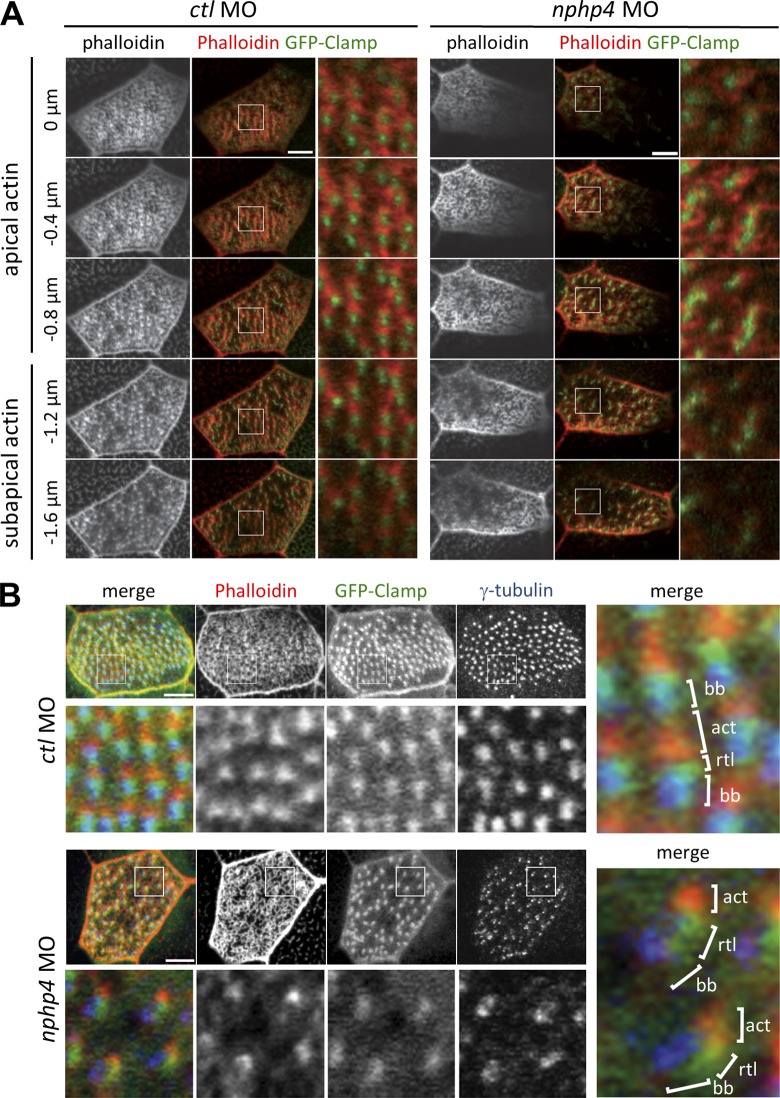 Figure 3. Nphp4 is essential for the organization of the subapical actin layer. (A) Serial confocal images for actin (phalloidin) and ciliary rootlets (GFP-Clamp) of cells with multiple motile cilia revealed that the subapical actin layer became irregular in nphp4-deficient Xenopus embryos, whereas apical actin pool remained unaffected. The depth of each optical section from the first section is shown on the left. A magnified image of the inset is shown on the right side (4× magnification). (B) Triple staining for actin (phalloidin, red in merge), ciliary rootlets (GFP-Clamp, green in merge), and basal bodies (γ-tubulin, blue in merge) revealed that actin filaments in the subapical actin layer connect a basal body with the ciliary rootlet of the neighboring basal body. In nphp4-deficient cells, the subapical actin layer was poorly nucleated and failed to provide the connection between basal bodies. Top panels show the maximum intensity projection of serial confocal images. Single optical sections at the level of the subapical actin pool (boxed area) are magnified and shown in the bottom panels (4.5× magnification). Right panels are higher magnification images of the single optical sections depicting the subapical actin organization (10.5× magnification). act, actin; bb, basal body; rtl, ciliary rootlet. Bars, 5 µm. |