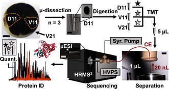 Figure 1. Microanalytical pipeline enabling multiplexing proteomic quantification of single embryonic cells in the 16‐cell Xenopus embryo using microdissection, micro‐scale bottom‐up proteomics, and a custom‐built single‐cell CE‐μESI platform for a high‐resolution tandem mass spectrometer (HRMS2). Key: HVPS, high voltage power supply; Syr. Pump, syringe pump. Scale bars: 150 μm (embryo and μESI, left‐middle panels), 250 μm (microcentrifuge vial), 1.5 mm (separation, right panel).