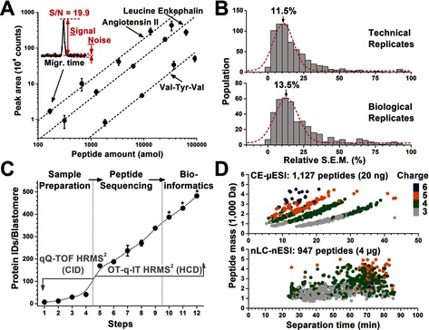 Figure 2. Advancing bottom‐up discovery proteomics to single cells using CE‐μESI‐HRMS. A) Quantification curves for model peptides with 25‐amol lower limit of detection and at least a 3‐log‐order linear dynamic range. B) Evaluation of technical and biological repeatability across a week of measurements. C) Proteomic coverage was enhanced using 20 ng digest by refining sample preparation‐separation (Steps 1–4), peptide sequencing (Steps 5–9), and data analysis (Steps 10–12). Experimental conditions are in Table S2. D) Comparing peptide identifications by CE‐μESI‐HRMS with nanoLC‐nanoESI‐HRMS, the closest neighbor of bottom‐up proteomic technology.