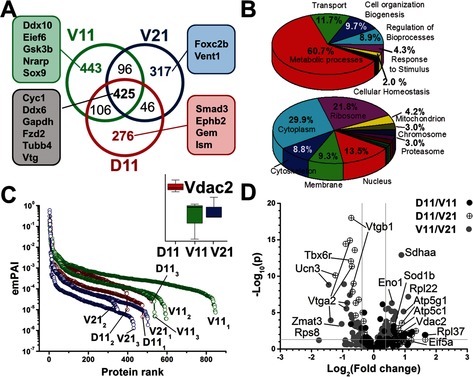 Figure 3. Single‐cell measurements uncovering translational asymmetry in the 16‐cell Xenopus embryo. A) Identification of 1709 different protein groups between D11, V11, and V21 cell types, suggesting proteomic cell differences (see peptide grouping in Figure S3 and proteins in Table S3). B) Gene ontology evaluation of biological processes (top) and sub‐cellular location of identified proteins (bottom). C) Protein abundances covered a 5–6 log‐order dynamic range. Differential expression shown for Vdac2 (Inset). D) Multiplexing quantification for 152 nonredundant protein groups between the D11/V11, D11/V21, and V11/V21 cell types. The volcano plot marks statistical and biological significance (p<0.05, ≥1.3‐fold change) and labels select proteins. Significant protein differences are shown in Figure S4 and listed in Table S5.