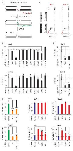 Figure 2. NEIL1 and NEIL2 are required for removal of 5fC and 5caC in HeLa cells.(a) Scheme of DNA glycosylase assay. A 160 bp synthetic, fluorescently-labeled oligonucleotide containing the indicated cytosine derivative was incubated for N-glycosidic bond cleavage by HeLa extract DNA glycosylases in absence of MgCl2. Base excision generates an abasic site, which can be converted into a single-strand break (nucleotide position 79) by recombinant APEX1, and monitored by denaturing PAGE.(b) Electropherograms of DNA glycosylase assays. Product peaks of glycosylase activities (79mers; arrows) are highlighted red with efficiencies shown as % of 79 nt peak integral relative to the total fluorescent signal per electropherogram. Data are representative of three independent experiments.(c) siRNA screen for DNA glycosylases required for 5fC and 5caC removal. Data represent percentage of abasic sites (% AP site) generated during the assay as quantified from strand cleavage products (79mer) post APEX1 treatment.(d) DNA glycosylase assay using HeLa extracts depleted of TDG and NEIL1 + NEIL2 by siRNAs.(e) DNA demodification assay as in Figure 1 b but with HeLa cell extracts depleted as in d.(f) LC-MS/MS quantification of genomic cytosine modifications from HeLa cells siRNA depleted of the indicated genes. Cells were transfected with TET1 catalytic domain to elevate levels of rare demethylation intermediates and to facilitate their mass-spectrometric detection.Error bars, s.d. (n = 3 assay repetitions (c-e) or cell culture transfections (f)). n.s., not significant. *P < 0.05, **P < 0.01, ***P < 0.005 by two-tailed unpaired Studentâs t-test. |