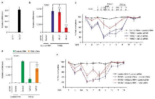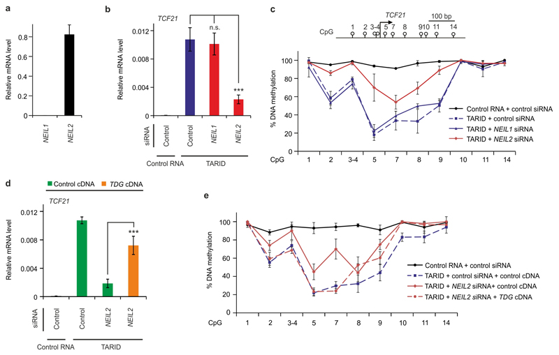 Figure 3. NEIL2 is required for demethylation of TCF21 in HNO387 cells.(a) qPCR expression analysis of NEIL1 and NEIL2 in HNO387 cells relative to HPRT1 (housekeeping gene).(b) qPCR expression analysis of TCF21 relative to HPRT1 in HNO387 cells upon transfection with control RNA (Control RNA), TARID and the indicated siRNAs.(c) Top, schematic representation of TCF21 promoter with transcription start site and CpGs analyzed. Bottom, methylation analysis of the TCF21 promotor by MassARRAY32 using HNO387 cells transfected as in b.(d) qPCR expression analysis of TCF21 as in (b). HNO387 cells were transfected with control RNA, TARID RNA, control siRNA and NEIL2 siRNA co-transfected with control or TDG expression plasmids as indicated.(e) Methylation analysis of the TCF21 promotor as in (c) using HNO387 cells transfected as in d.Error bars, s.d. (n = 3 cell culture transfections). n.s., not significant. *** P < 0.005 by two-tailed unpaired Student’s t-test. |