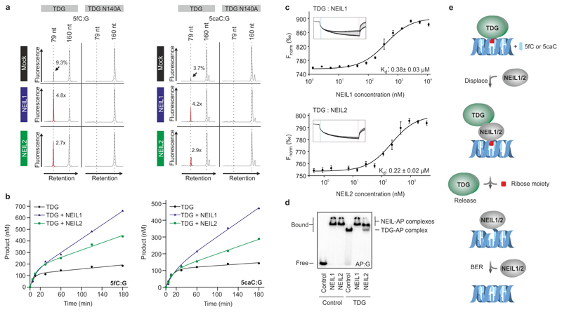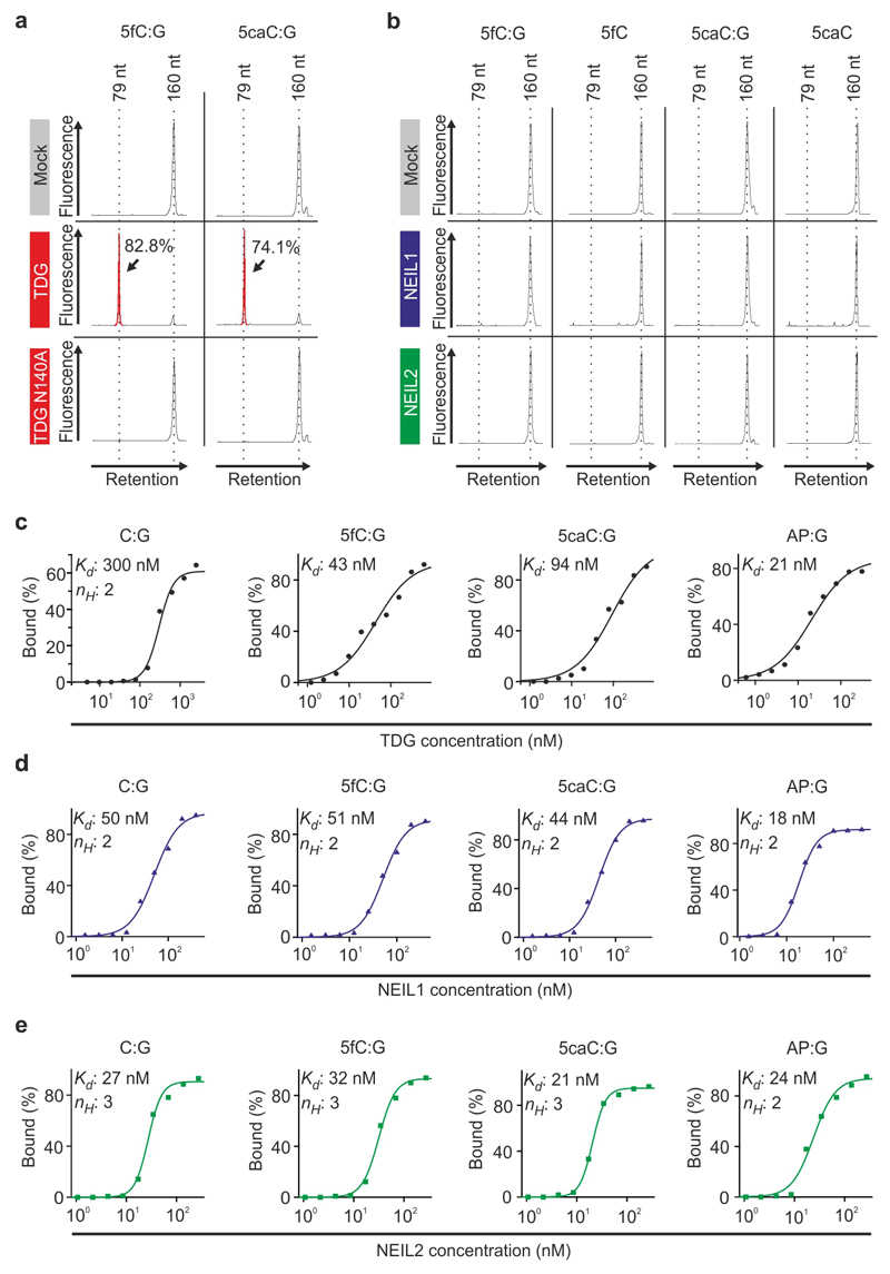 Figure 4. NEIL1 and NEIL2 do not process and bind 5fC and 5caC in vitro.(a,b) Electropherograms of reaction products from DNA glycosylase assays with 20 nM ds (5fC:G; 5caC:G) and ss (5fC; 5caC) oligonucleotide substrates. Recombinant DNA glycosylase was in 10-fold excess over oligonucleotide substrate (single turnover conditions). (a) Human TDG (reaction products highlighted in red with efficiencies shown in %) and catalytically inactive mutant TDGN140A. (b) Human NEIL1 and NEIL2. Data are representative of three independent experiments.(c-e) DNA binding assays with TDG, NEIL1 and NEIL2. Fitted curves, calculated dissociation constants (Kd) and Hill coefficients (nH) derived from electrophoretic mobility shift assays towards indicated ds oligonucleotides are shown. Binding assays are representative of two independent experiments with similar outcome. |