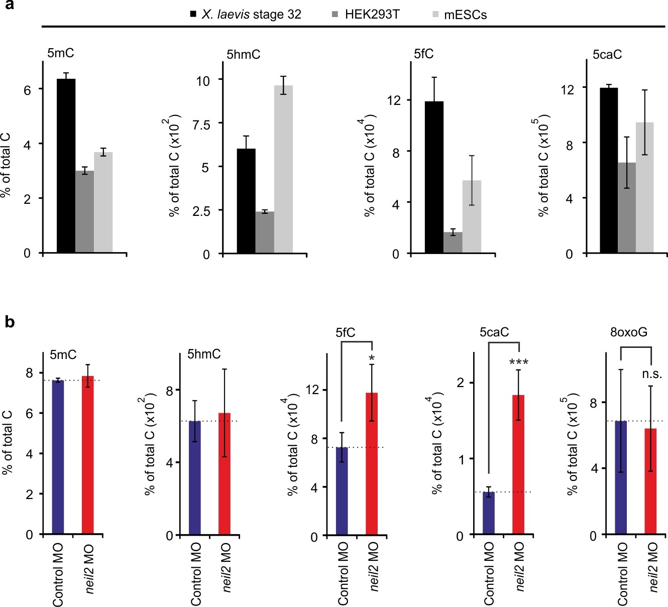 Supplementary Figure 7 Relative abundance of X. laevis genomic DNA modifications. (a) Quantification of total genomic 5mC, 5hmC, 5fC and 5caC levels in X. laevis whole embryos at stage 32, human HEK293T cells and mouse ES cells (mESCs) by LC-MS/MS. Error bars, s.d. (n = 3 X. laevis embryo batches consisting each of at least 5 embryos and 3 cell cultures of HEK293T and mESCs, respectively). (b) LC-MS/MS quantification as in (a) but in control and neil2 morphant Xenopus animal cap explants including measurements of 8oxoG. Error bars, s.d. (n = 3 explant batches each consisting of 20 animal cap explants). n.s., not significant. *P < 0.05, ***P < 0.005 by two-tailed unpaired Student’s t-test. |