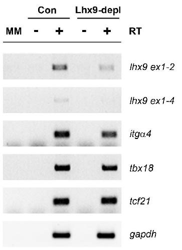Figure S8. RT-PCR validation of epicardial marker expression in Lhx9-depleted hearts. RT-PCR was performed on equivalent amounts of RNA from control or Lhx9-MO1-depleted hearts from stage 41-42. Lhx9 is significantly depleted by two PCR amplification methods, as well as decreased itg4. Tbx18 and tcf21 appeared indistinguishable. Gapdh used as loading control. |