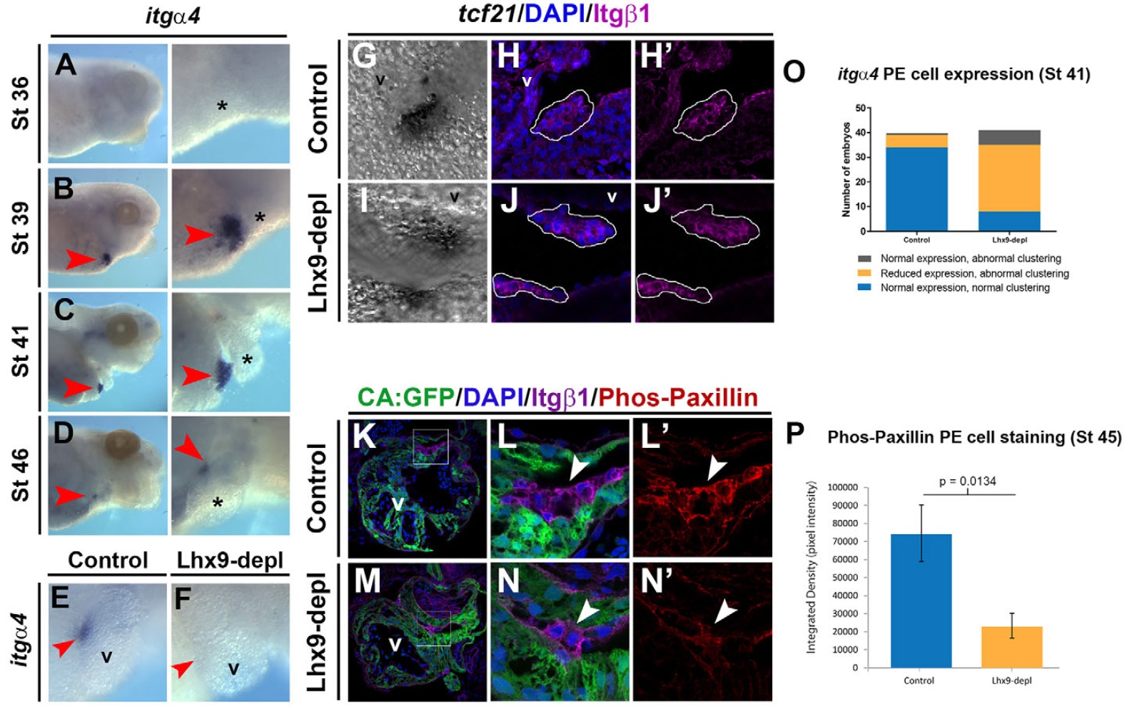 Fig. 4. Lhx9 regulates integrin α4-paxillin signaling in PE clusters. (A-D) Whole embryo in situ hybridization for itga4, stages 36 to 46. Lateral views of anterior portion (left panels) with magnified image of cardiac region (right panels). Red arrowheads indicate PE cluster; asterisks indicates heart. (E,F) In situ hybridization for itga4 in control (E) and Lhx9-depleted embryos (F) at stage 41. Representative cardiac region shown, anterior to right, dorsal to top; red arrowhead marks PE cluster. (O) Quantification of observed itga4 expression (reduced expression denoting â¤50% stain intensity compared with controls) and clustering defects shown in E,F (see Fig. 2M for phenotype assessment), embryos taken from six independent experiments, Pâ¤0.0001 by Chi-square test. (G-Jâ²) Transverse cardiac region agarose sections from control (G-Hâ²) and Lhx9-depleted (I-Jâ²) stage 41 embryos post-in situ hybridization for tcf21 (G,I), nuclei expression with DAPI (H,J, blue) and Itgβ1 immunohistochemistry (Hâ²,Jâ², magenta). White outlines (H,Hâ²,J,Jâ²) indicate PE cluster as depicted by tcf21 and Itgβ1. (K-Nâ²) Transverse cardiac region agarose sections from control (K-Lâ²) and Lhx9-depleted (M-Nâ²) stage 45 Xla.Tg(Cardiac-actin:GFP)Mohun embryos depicting representative immunohistochemical analysis for DAPI (blue), GFP (green) to label cardiomyocytes, Itgβ1 (magenta) to label epicardial cells and phosphorylated Y118-paxillin (red). Magnified images (L,Lâ²,N,Nâ²) from white boxes in K,M. White arrowheads indicate PE cluster. (P) Pixel intensity (integrated density) levels for phosphorylated Y118-paxillin from five control and 10 Lhx9-depleted embryos; P=0.0134 by two-tailed Studentâs t-test. v, ventricle. |