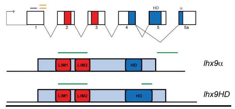 Figure S1. Lhx9 genomic loci and isoform organization Schematics of X. laevis Lhx9 genomic locus (top) and mRNA (bottom), showing localization of LIM protein binding domains (red) in exon 2 and 3, and the DNA-binding homeodomain in exons 4 and 5 (blue). Not to scale. Note that lhx9α isoform harbors a truncated HD due to alternative splicing to exon 5a. Translation-blocking (purple) and splice-blocking (orange) Morpholinos are depicted on exon 1 of genomic locus. Green bars on mRNA schematics depict localization of in situ hybridization probes. |