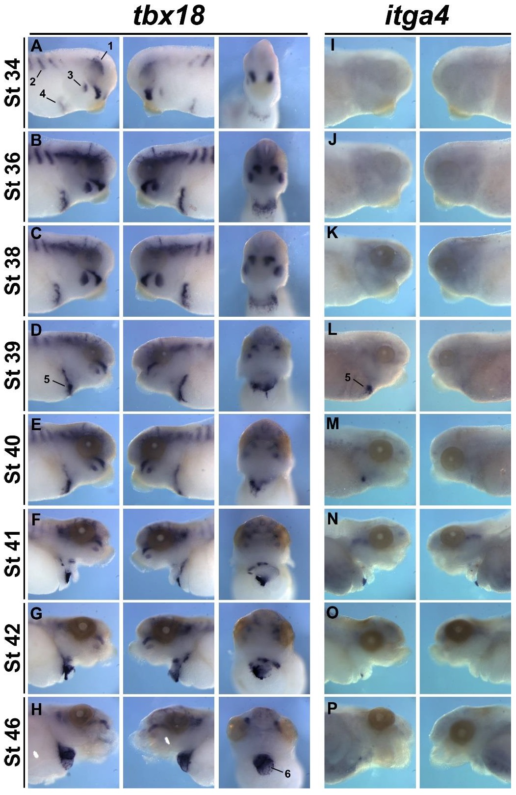 Figure S3. Spatio-temporal analysis of tbx18 and itga4 during Xenopus embryogenesis. (A-H) In situ hybridization of tbx18 showing right, left and ventral views of wild-type embryos from stage 34 to 46, anterior region of embryo. (I-P) In situ hybridization of itga4 showing right and left views of anterior region from stage 34-46. 1; cranial mesoderm, 2; somites, 3; branchial arches, 4; septum transversum, 5; proepicardial cluster, 6; epicardium. |