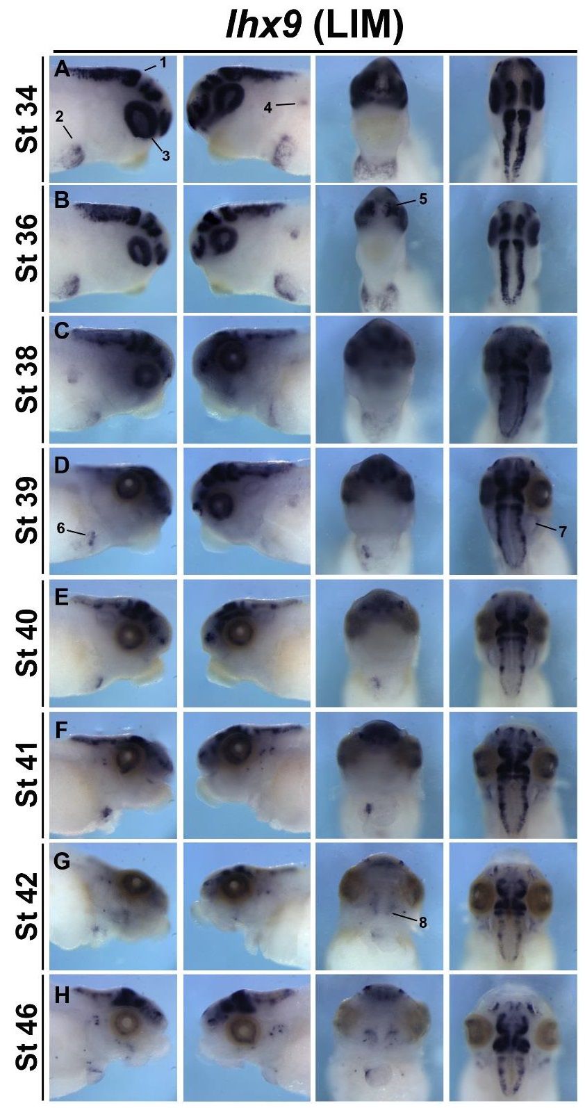 Figure S6. Spatio-temporal analysis of lhx2 during Xenopus embryogenesis. In situ hybridization right, left, ventral and dorsal views of wild-type embryos showing lhx2 expression of the anterior region over time, from stage 34 to stage 46. 1; lung bud, 2; neural tube, 3; retina, 4; mandibular arch, 5; branchial arches, 6; pineal gland, 7; otic placode, 8; lower jaw. |
