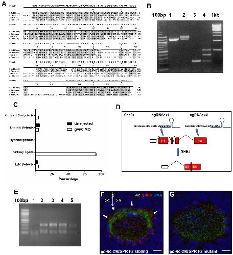(D and E) Schematic showing the CRIPSR/Cas9-mediated genome modification at the zebrafish gmnc locus designed to excise a