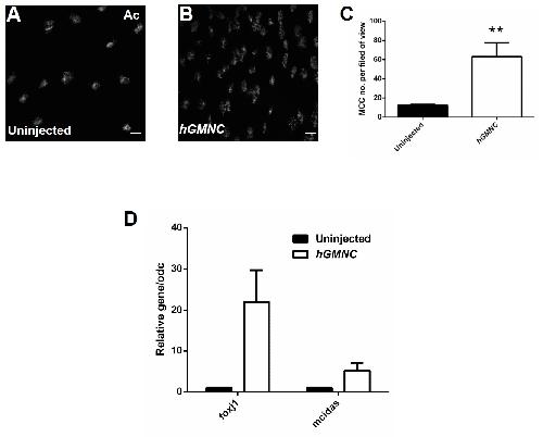 (A-C) Embryos injected with 80pg human GMNC RNA (B) displayed ectopic MCCs compared to uninjected embryos (A) at stage