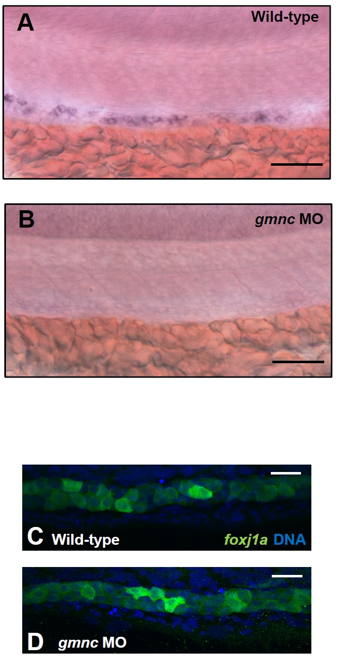(A). Its expression is lost in the gmnc morphants (100%, n=20) (B). Scale bars: 50μm.