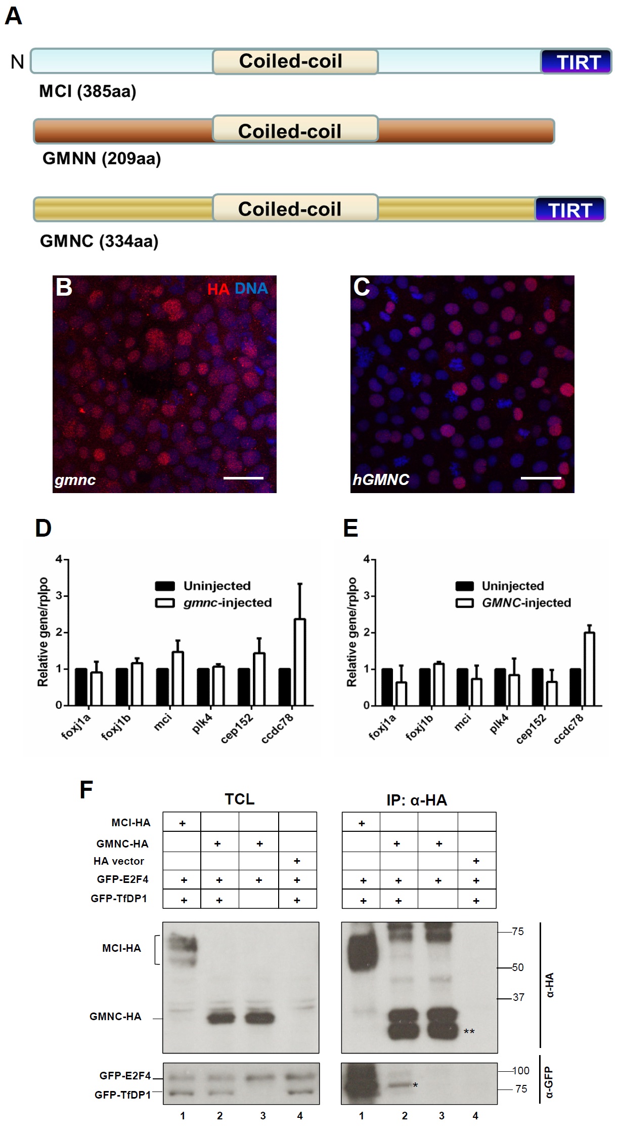 (D and E) Quantitative qPCRs were performed on zebrafish gmnc-HA (D) or human GMNC-HA (E) RNA-injected embryos at 24