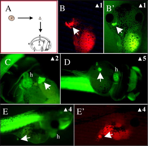 Fig. 5. Host shows broad spatial competence for the development of the secondary heart. (A) GATA4 injected reaggregates (CAG-GFP) were transplanted at stage 20 into host embryos (CAG-GFP) at the same stage in a number of different regions, as indicated by the number. (B, Bâ²) 51% of transplants in the head showed GFP expression but did not beat (n = 20). (CâEâ²) Transplants in the lateral (position 5) and the caudal side (position 4) of host embryos developed beating SH as control ventral transplants. Transplant were all analysed at stage 39. (B, Eâ²) lineage tracing (rhodamine dextran) of transplants whose cardiac GFP activity is shown in Bâ² and E, respectively. h, heart. |