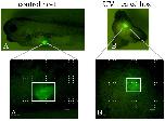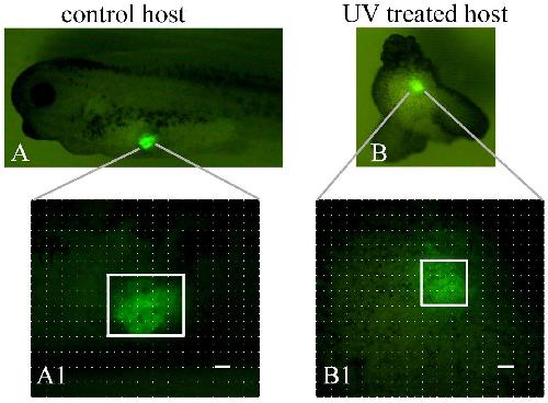 Figure S3. UV-treated host does not support the growth of the reaggregate. Representative examples of (A) control transplants (n=40) and (B) UV-treated transplants (n=40) that were analysed at stage 39 using the fluorescent microscope. Transplants (CAG-GFP), marked with white rectangular, were positive in all transplant samples for GFP expression. The 2D analysis showed that 80% (n=32) of transplants placed in UV-treated host embryos have smaller size when compared to control transplants. (A’, B’) Higher magnification of transplants into control and UV-treated hosts. The bar corresponds to 100μm. |